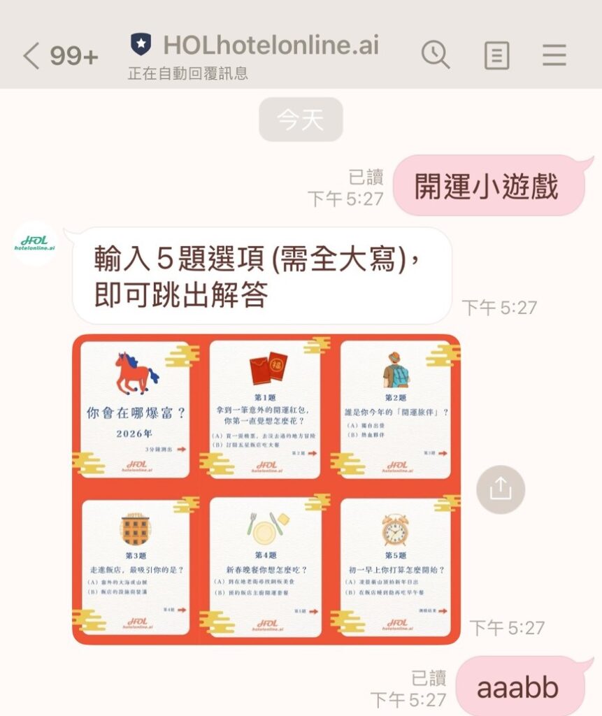 遊戲過程中會詢問你一些簡單的問題,例如「會選擇哪些開運夥伴同遊」,以及「拿到意外的開運紅包要怎麼花」。只需按照題目提示,輸入5題答案選項並傳送,系統就會分析出你今年最旺的招財能量點。