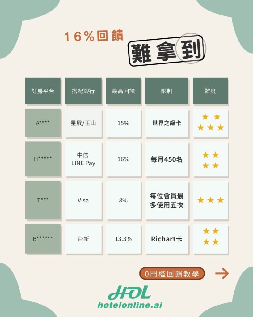 - 專屬網頁 vs APP:許多銀行的 10%~12% 優惠限於「專屬連結」訂房,直接打開手機 App 往往只能拿到基本回饋。