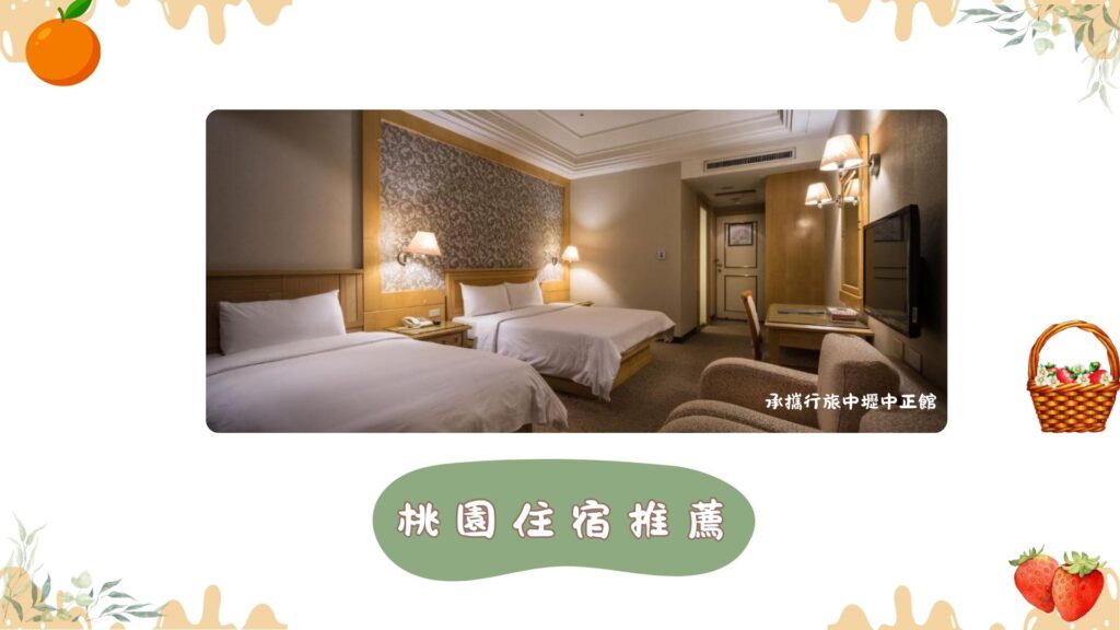 桃園地區交通便利,選擇鄰近中壢或大溪的飯店,能讓您在第一天玩累後迅速休息,第二天再繼續桃園的果園之旅。